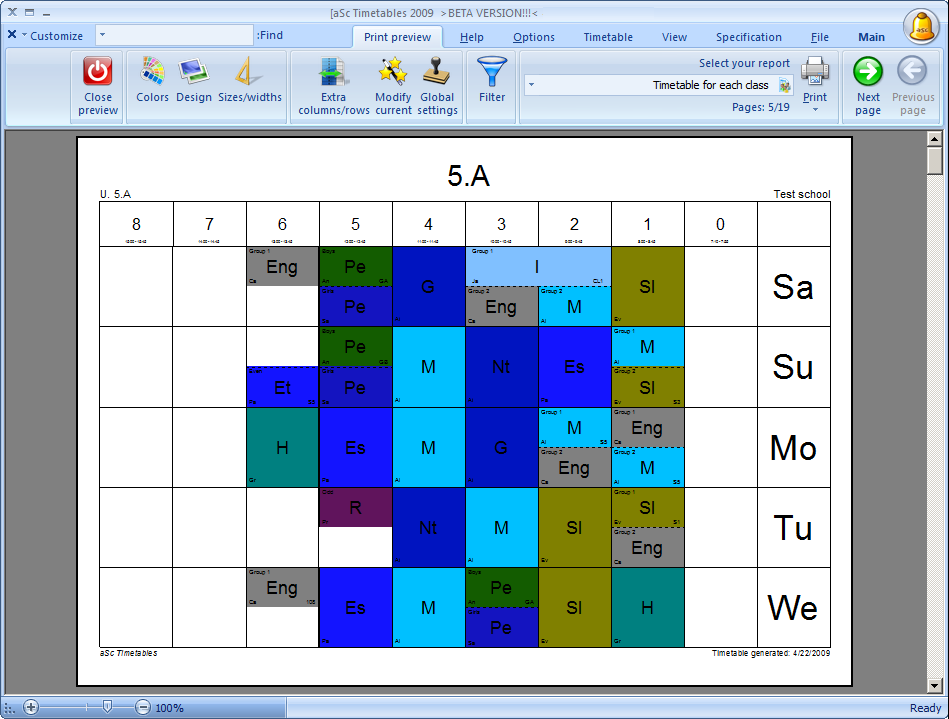 The print preview section has changed, shall be now more straightforward to customize your printouts. This allow you to quickly define colors, sizes of timetables and new features like Extra columns and headers that can provide your custom information for each row/column in your timetable