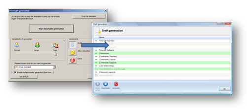 A new generation mode called 'draft' has been added. This can help you in early stages of timetable generation. It allows you to turn off or on whole groups of constraints and try to generate the draft timetable.