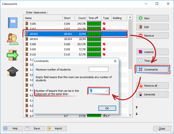 You can specify that classroom can accomodate more lessons at once: