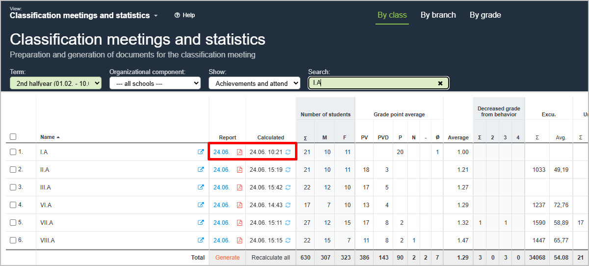 If you have already generated and saved the classification report (i.e., you see a PDF file in the Report column) and you later changed grade or attendance data, you must not only recalculate the statistics but also regenerate and save the classification report. Simply recalculating the data does not update the PDF classification report.