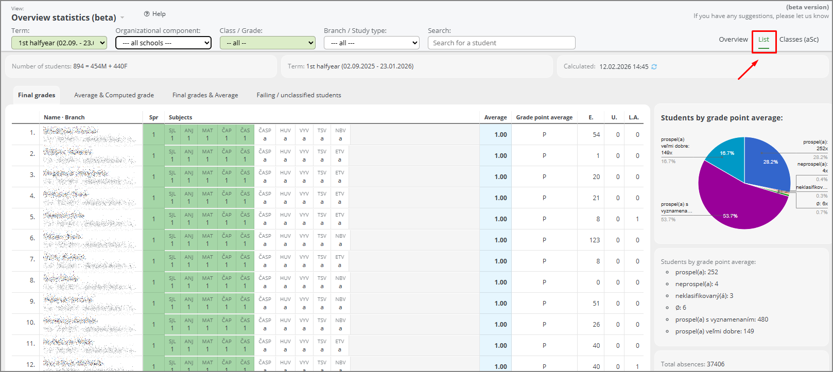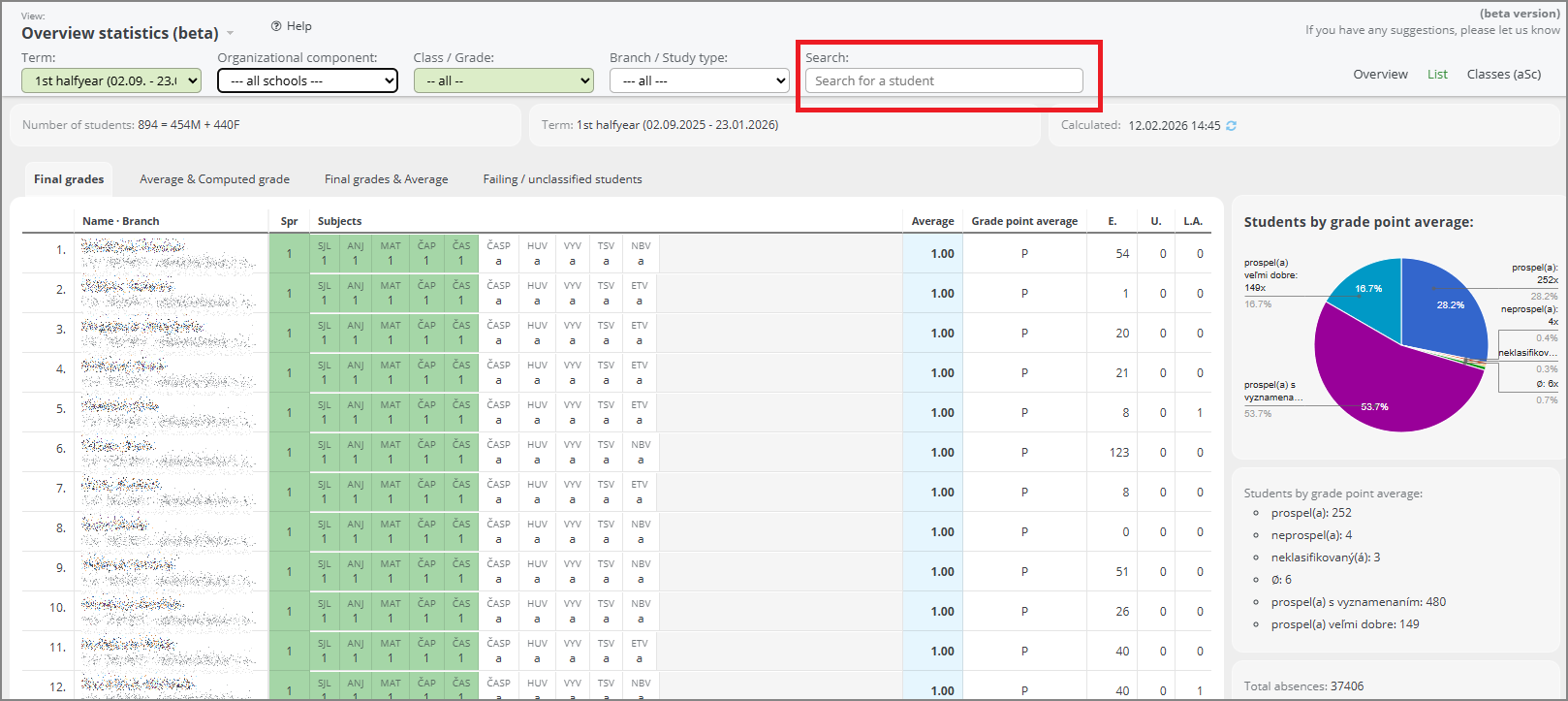 In the statistics, switch the view to the student list. All students of the school will be displayed, grouped by class and listed in alphabetical order.