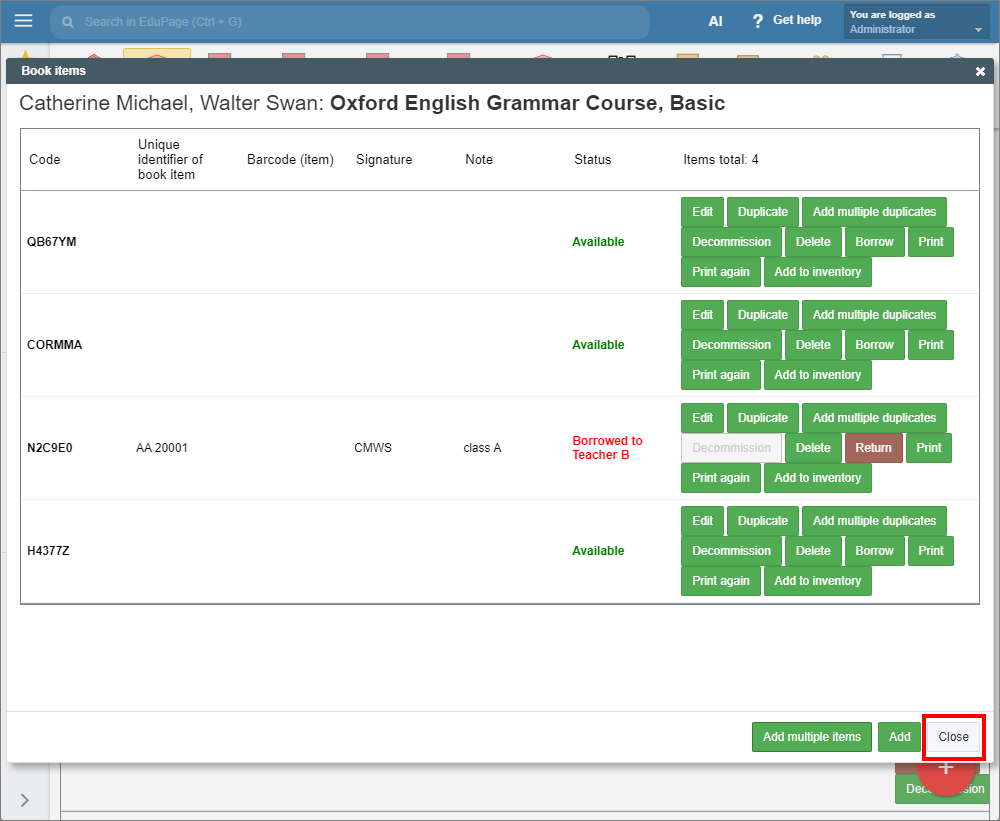 Click “Close” to exit the main Book Items window.