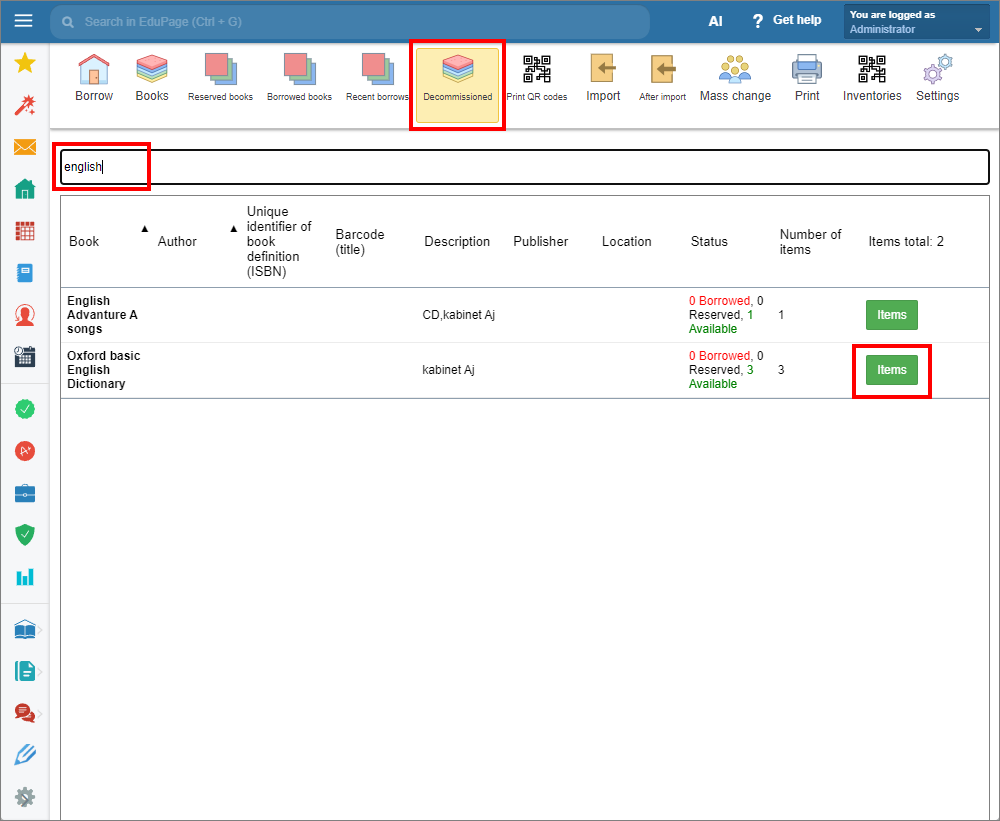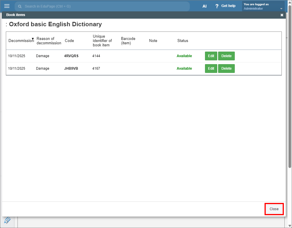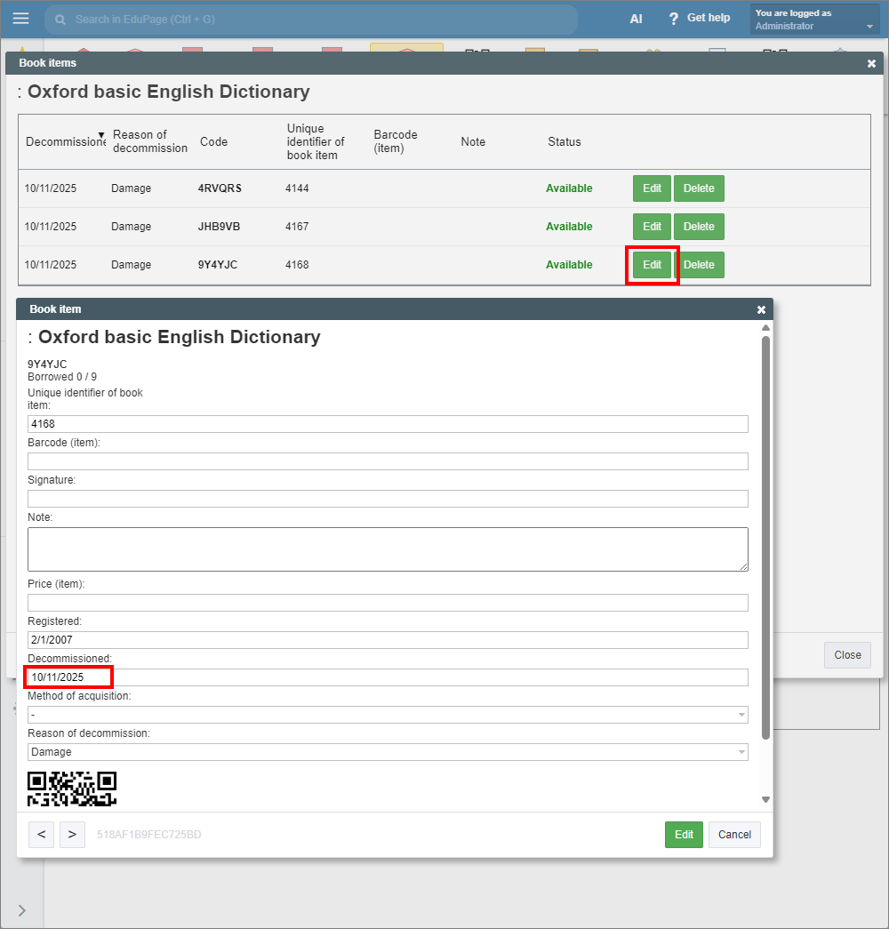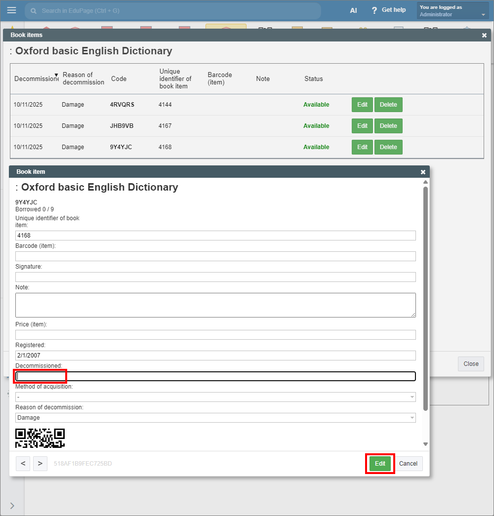 In the book item window, delete the date in the “Decommissioned” field. Click “Edit” to confirm.