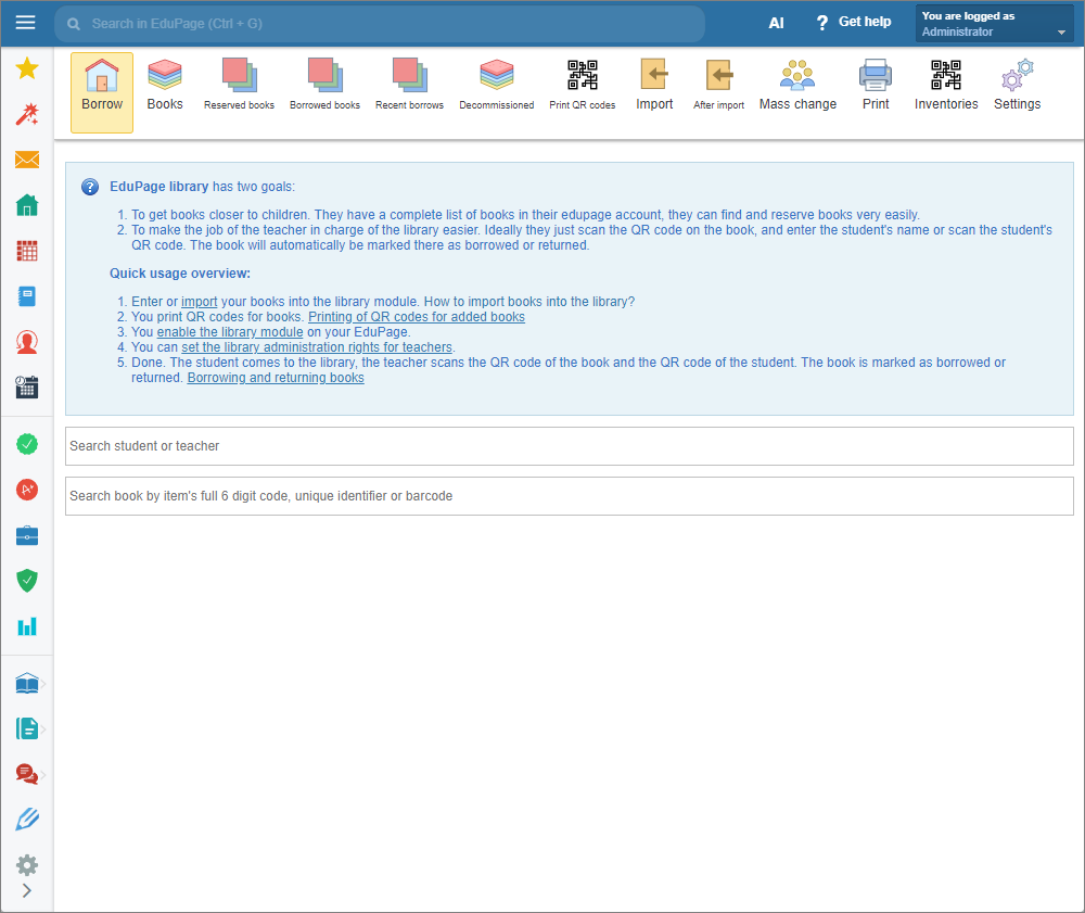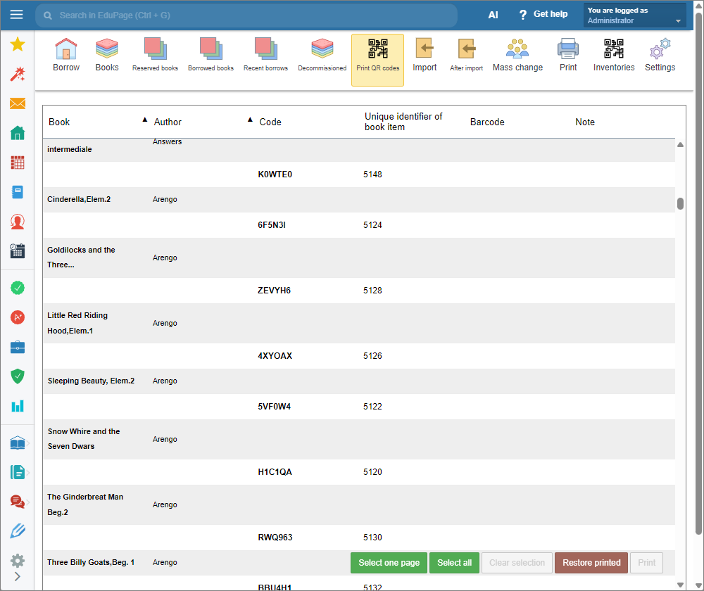 In the “Print QR codes” you can print QR code labels for the books in your library to enable lending and returning books by scanning the code.