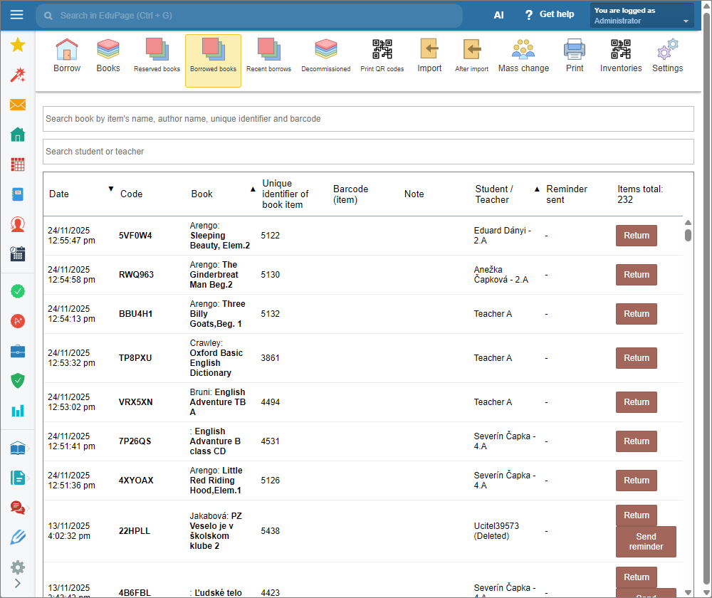 In the “Borrowed books” tab, you can view the list of loans. You can search for loans by borrower or book title, with loan dates displayed. You can also return items from this tab.
