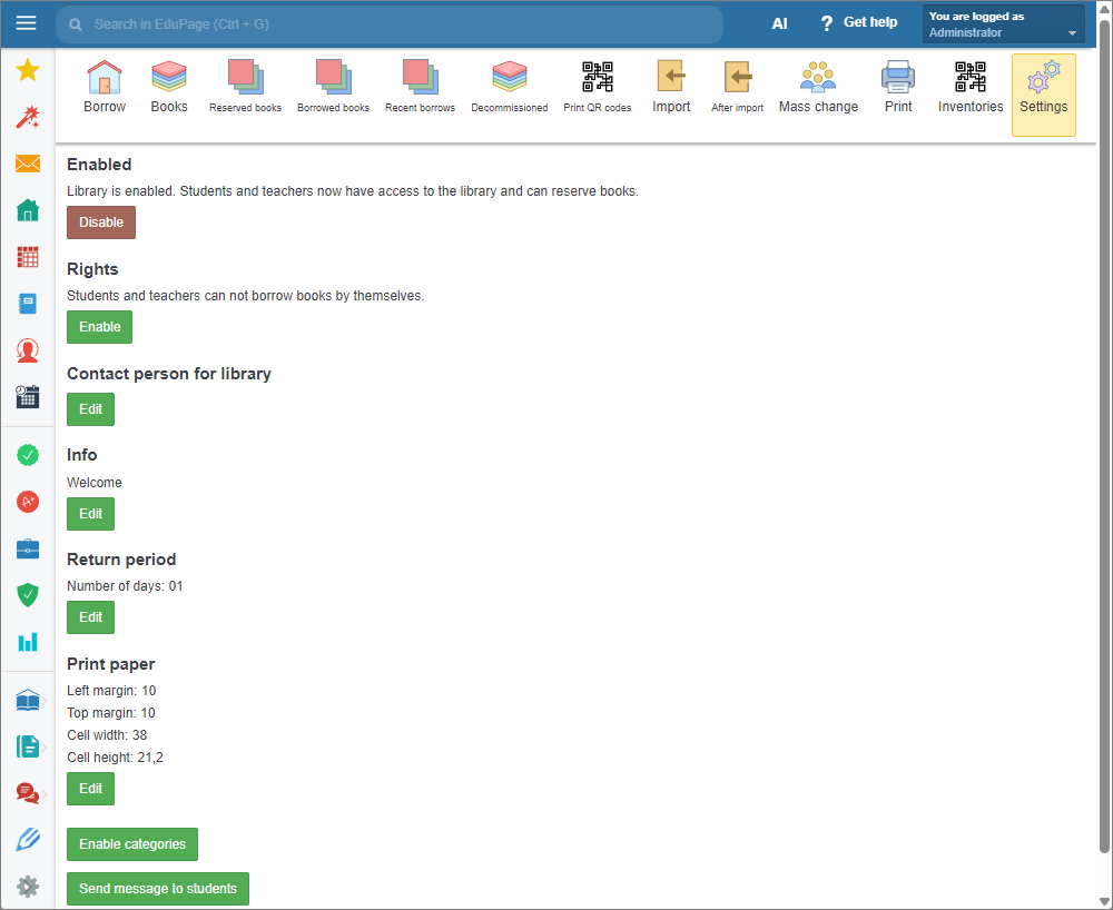 In the “Settings” tab, you can enable or disable access to the Library module, allow teachers to borrow books for their classes and/or for themselves, set the library contact person, define library information visible to users, set the loan period, set the print size of QR-code labels, enable a broader list of categories and create and send a message to students.