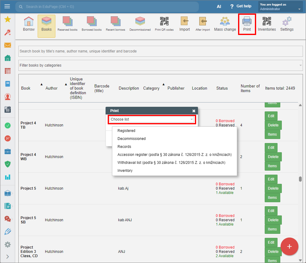 Go to the “Print” tab to print your accession register, withdrawal list, holdings list, or inventory records.