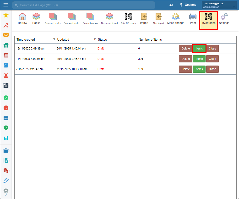 To perform an inventory check of the physical items in your library use the “Inventories” tab in the main menu.