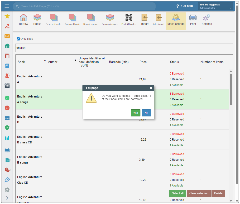 If any of the selected items are currently borrowed, a warning window will appear. You will then have the option to confirm or cancel the operation.