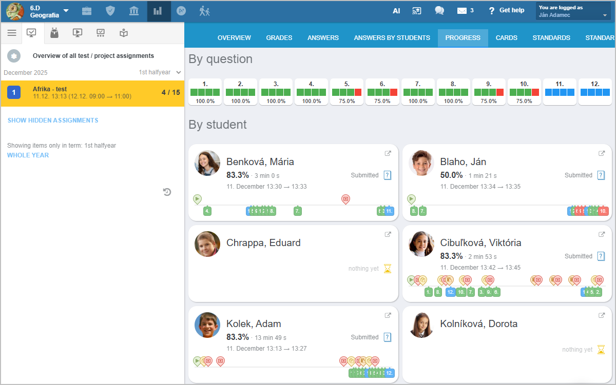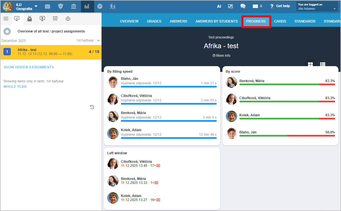 In the Progress tab of the results, the teacher can see various useful details about how the test proceeded:
