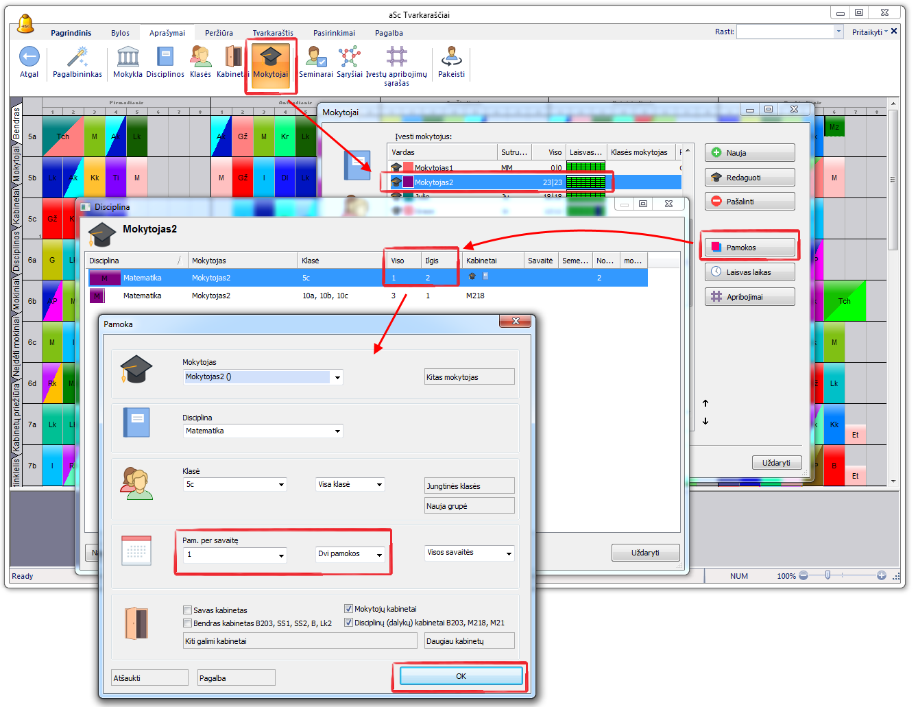 Galite tiesiog įrašyti kad mokytojas turi ir paprastas (vienos akad. valandos trukmės), ir dvigubas pamokas (dviejų valandų ilgio), pvz. tris paprastas ir vieną dvigubą.