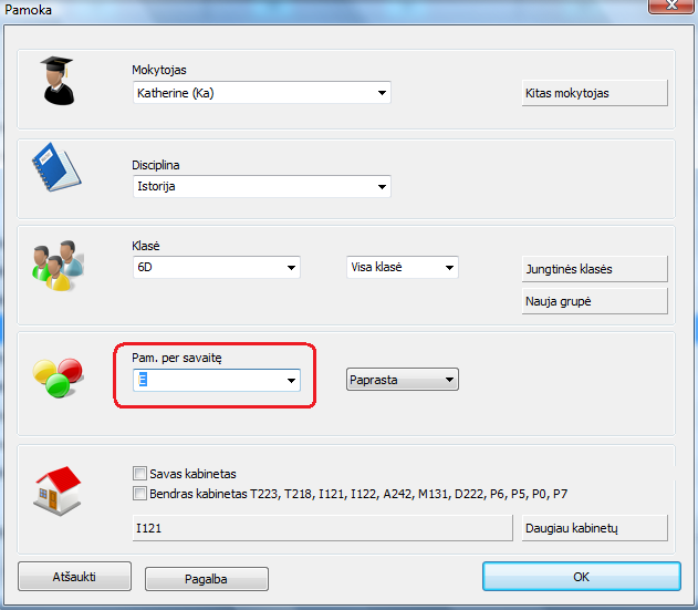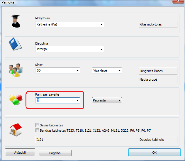 Įrašius, pavyzdžiui, 5, turėsite 5 pamokas per savaitę, jos galės vykti skirtingu laiku (skirtingu pamokos periodo metu, t.y. kaip 1, 2, 3 ir t.t. pamoka).