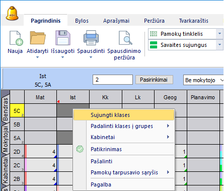 Pamokų tinklelyje galima greitai apjungti kelias klases vienai pamokai: