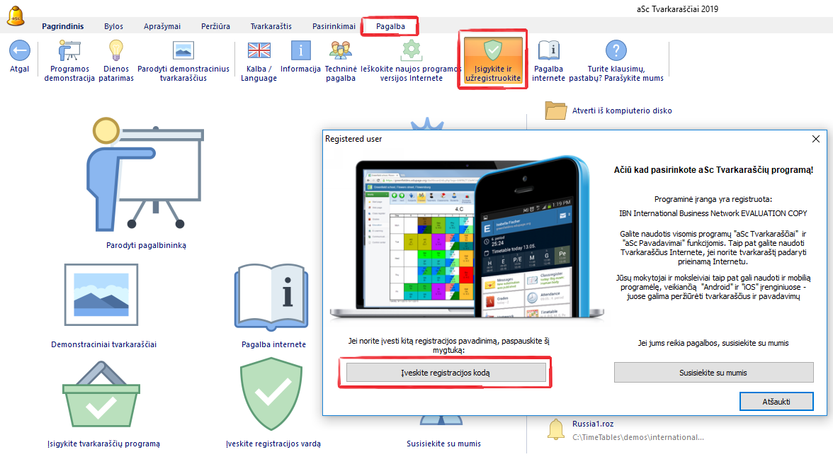 Į pirmąjį lauką "Registracijos vardas" reikia įvesti mokymo įstaigos pavadinimą (tiksliai tokį, koks bus nurodytas registracijos informacijoje, geriausiai su Copy/Paste, CTRL-C ir CTRL-V), o į antrąjį lauką - "Registracijos kodas" - registracijos kodą (tai skaičių ir raidžių eilutė), kurį Jums atsiųs UAB "Tarptautinis verslo tinklas".