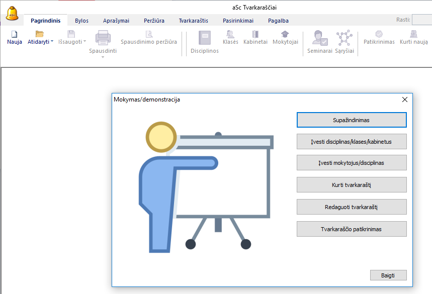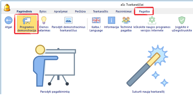 Mokymo ir demonstracinę programą galima paleisti, pasirinkus "Pagalba, Programos demonstracija":