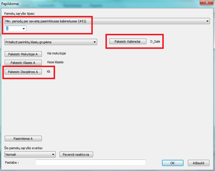 Jei pasirinksite "Taikyti pasirinktoms klasėms", programa patikrins, ar yra 1 kūno kultūros pamoka tai klasei, bet atskirų grupių nebepatikrins. Tuomet pamoką didžiojoje salėje gali turėti berniukų grupė, o mergaičių - nebe.