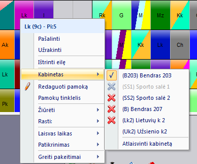 Paspaudus norimą pamokos kortelę tvarkaraštyje dešiniu pelės mygtuku ir pasirinkus komandą "Kabinetas", programa parodys galimų kabinetų šiai pamokai vykti sąrašą: