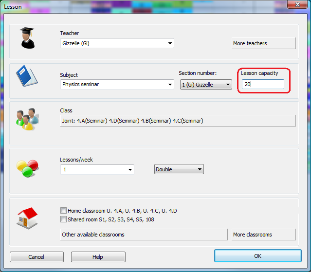 אפשר להזין מספר מקסימלי של תלמידים שניתן לשבץ לסמינר הנתון . ניתן להזין זאת בתיבת השיח "שיעור" בשדה "קיבולת שיעור":