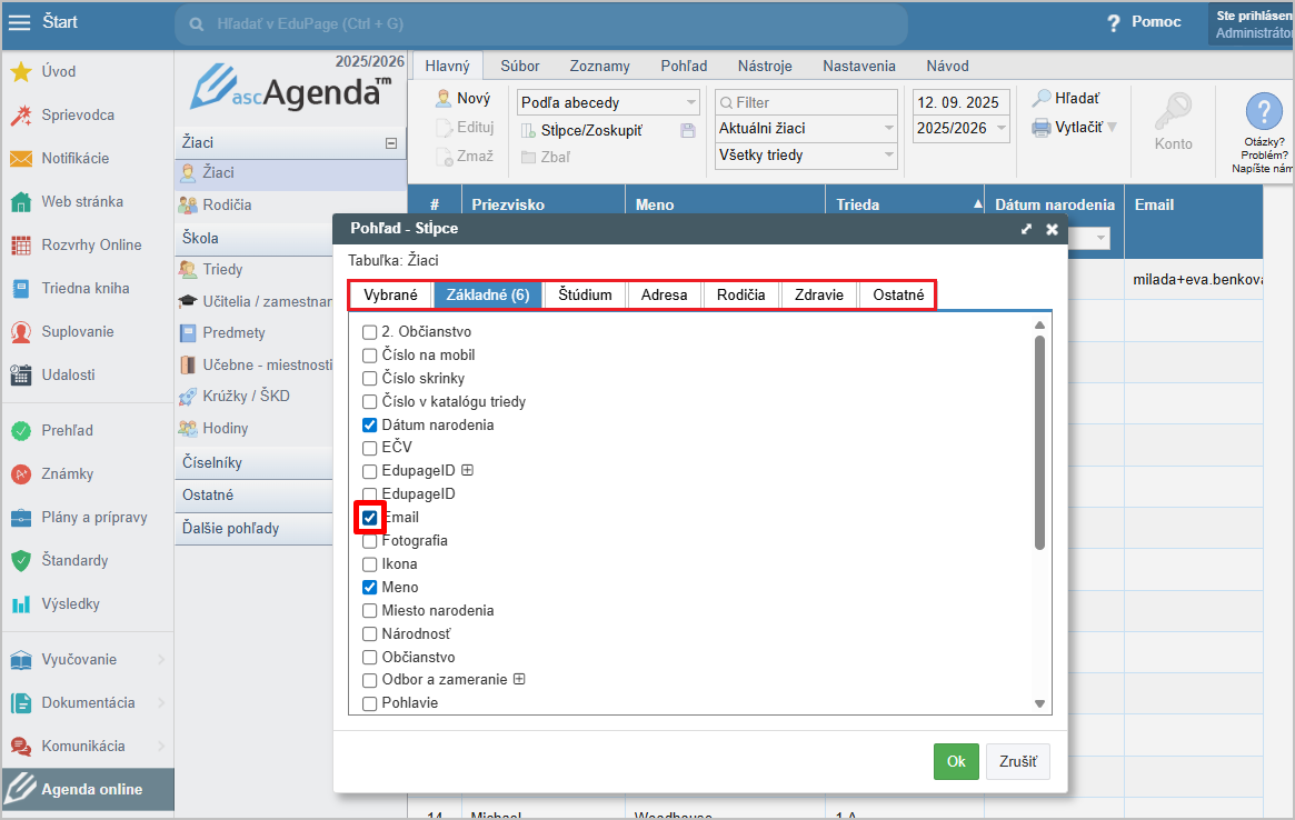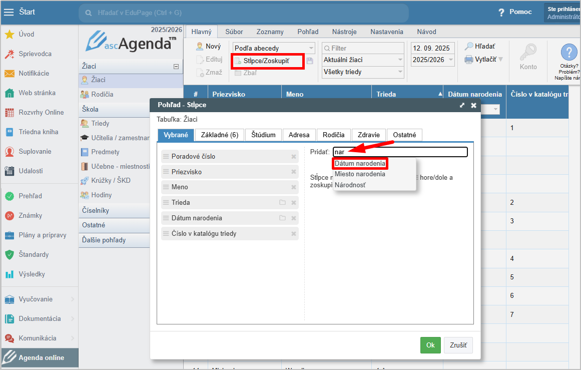 V Agende online si môžete vybrať stĺpce, ktoré sa v prehľade majú zobrazovať.