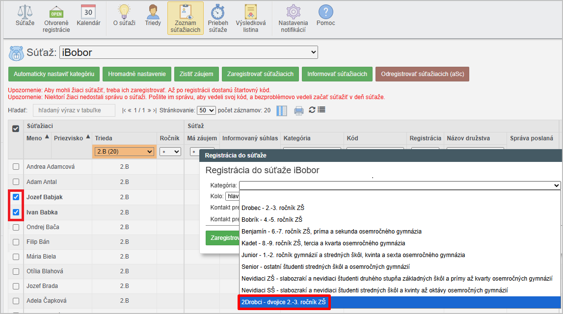 V module Súťaže v časti Zoznam súťažiacich označte dvojicu žiakov.