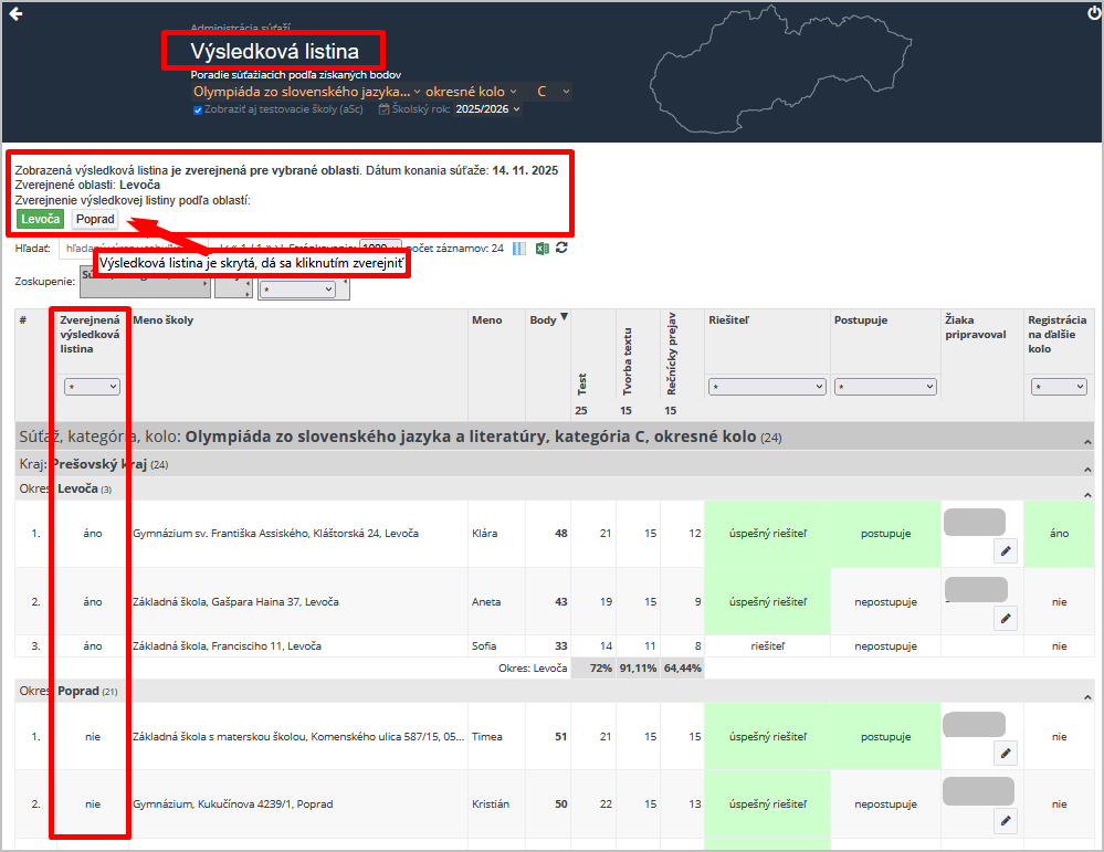 Uvidíte výsledkové listiny za okresy, na ktoré máte právo. Sivé sú nezverejnené, zelené zverejnené. Kliknutím na daný okres/kraj listinu zverejníte, opätovným kliknutím ju odzverejníte. Zverejnené výslekdové listiny sa zobrazia v module škôl v danej oblasti (v danom okrese alebo kraji).