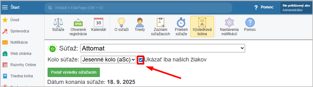 Výsledok môžete poslať priamo aj svojim žiakom ako Správu v EduPage stlačením tlačidla Poslať výsledky súťažiacim: