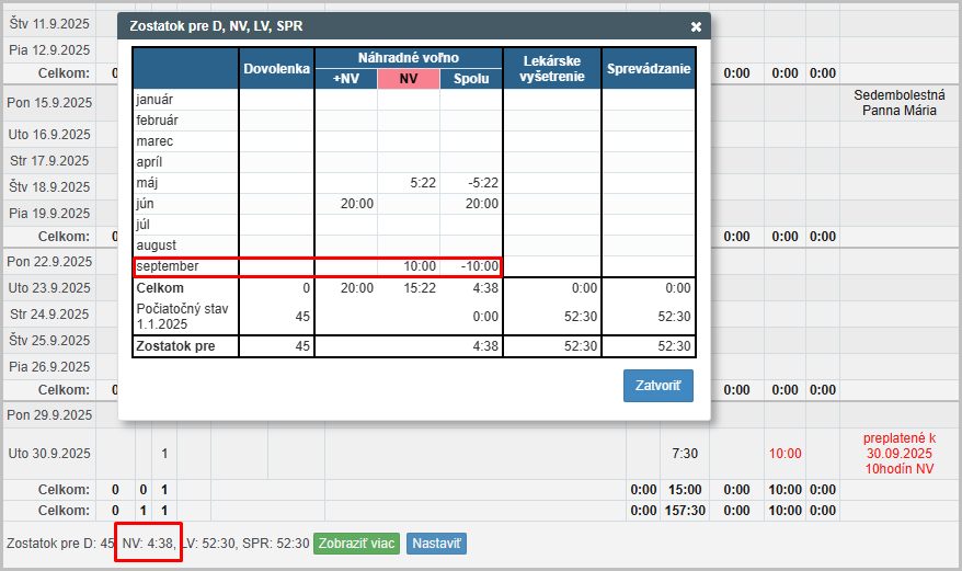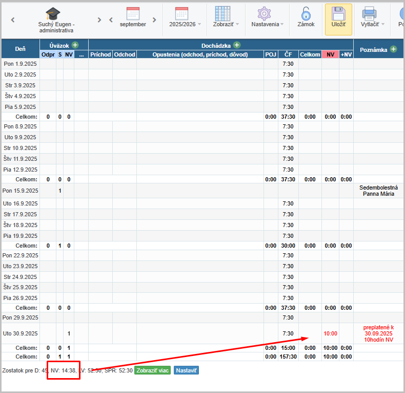 - stĺpec červené NV k 30.09.2025 - zapíšeme 10 hod (hodiny budú vyčerpané, nakoľko idú na preplatenie)