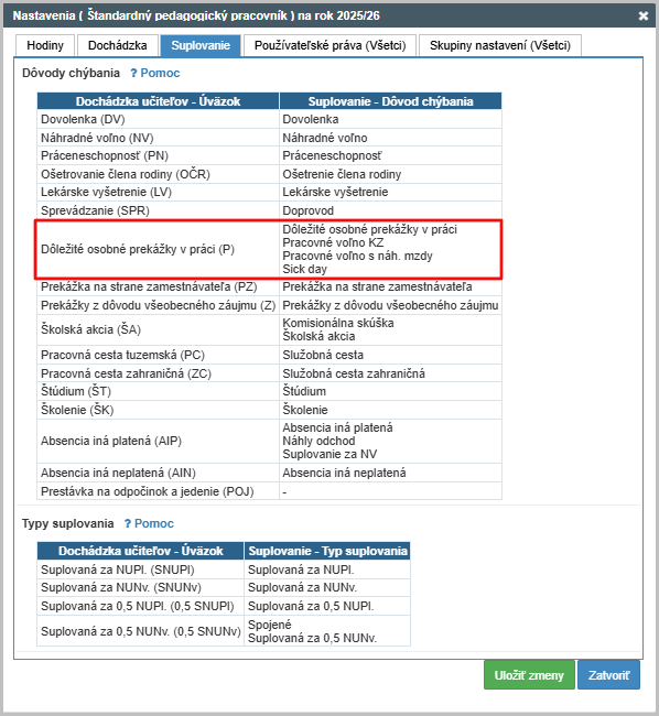 Ak si dané voľno čerpá zamestnanec počas roka, a je potrebné suplovanie, zaevidujeme si ho cez modul Suplovanie. Vyberieme buď typ "Dôležité osobné prekážky v práci a do poznámky, priamo v suplovacom okne, zapíšeme konkrétny typ, ktorý sa po vypublikovaní zobrazí aj v dochádzke.