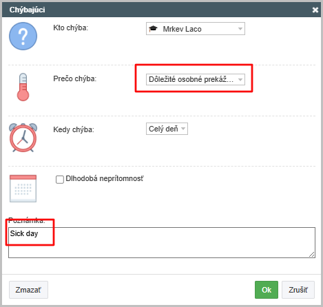 Ak je dané voľno čerpané počas napr. jesenných prázdnin, nie je potrebné suplovanie. Zapíše si buď učiteľ alebo mu zapíšeme daný typ na daný deň ručne do dochádzky pod vyššie spomínaný druh neprítomnosti a konkrétny typ zapíšeme do poznámky.