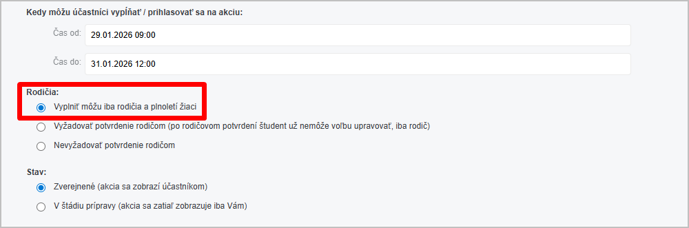 Na záver zvoľte, že prihlasovaciu akciu môžu vyplniť iba rodičia. Deťom notifikácia o prihlasovaní nepríde.