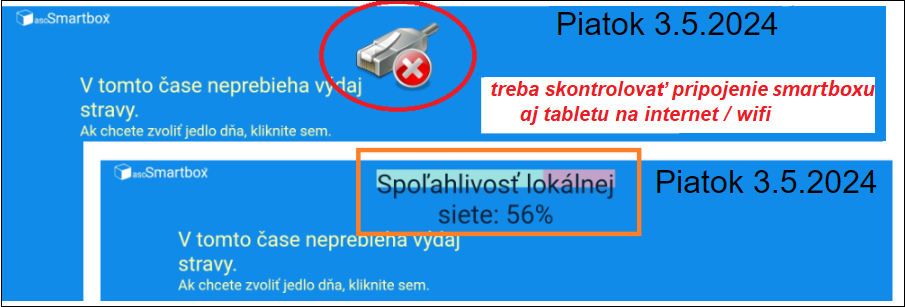 --- ak je tablet bez wifi alebo je znížený signál - hore v strede je "Spoľahlivosť lokálnej siete: xx%"