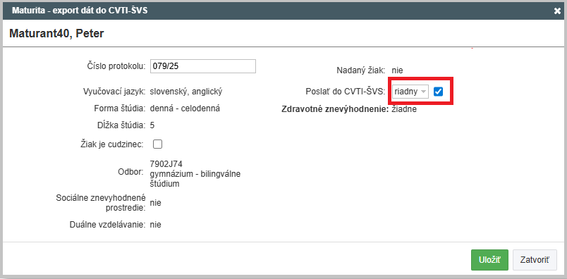 Ako označiť, že niektorý zo študentov sa má / nemá odoslať do CVTI ŠVS ?