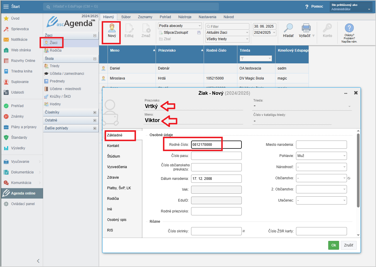 Otvorte si sekciu Žiaci a kliknte na tlačidlo Nový.
