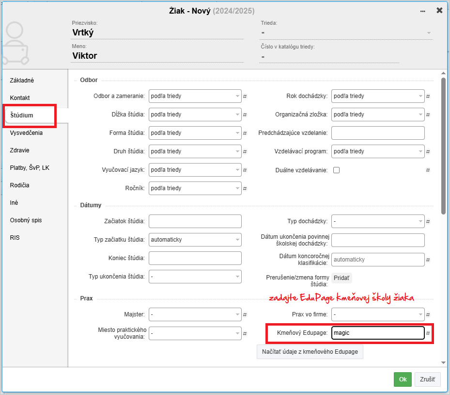 Aby sa prepojil žiak a načítali sa jeho známky a dochádzka z kmeňovej školy, treba zadať