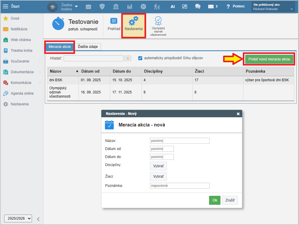 V prostredí administrácie modulu môžete vytvoriť meraciu akciu pre zvolené disciplíny. Učiteľom to uľahčí výber žiakov pri zapisovaní výsledkov.
