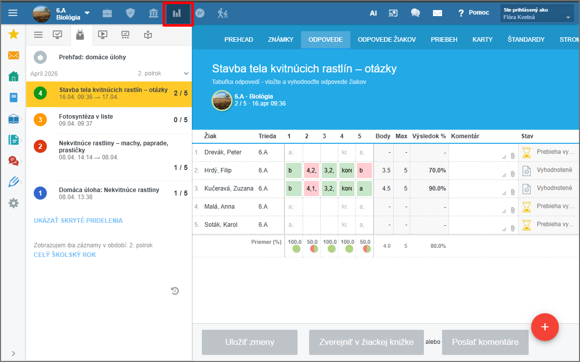 Po pridelení môžete cez Výsledky sledovať odpovede žiakov, ich úspešnosť a prípadne ich prácu ohodnotiť.