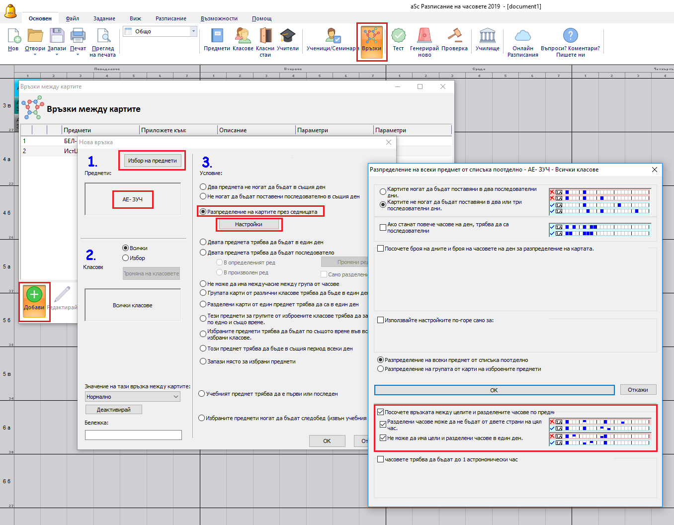 В някои училища определени учебни предмети се преподават по такъв начин, че по-голямата част от часовете учениците имат заедно като клас, но например, за един час, те се разделят на две групи. В тази ситуация е важно да поставим някои ограничения, така че седмичното разписание да е разпределено правилно: