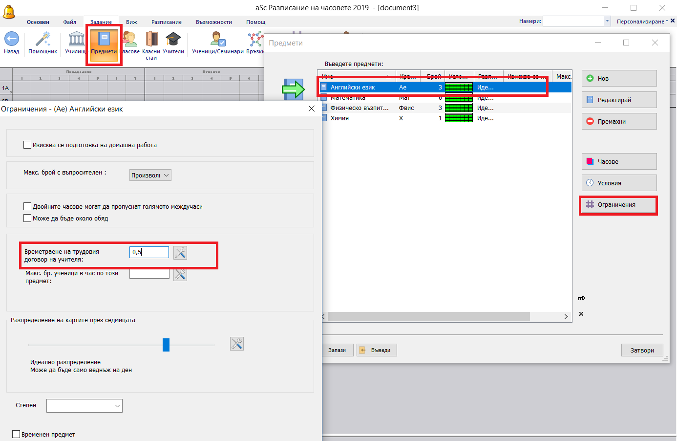 Възможно е да обозначите дължината на всеки учебен предмет. Например, ако имате часове по разговорен английски език, които са с 0.5 часа над общия брой часове на учителя по норматив, може да обозначите това в диалоговия прозорец Предмети/ Ограничения. Този брой оказва влияние само върху норматива на учителя.