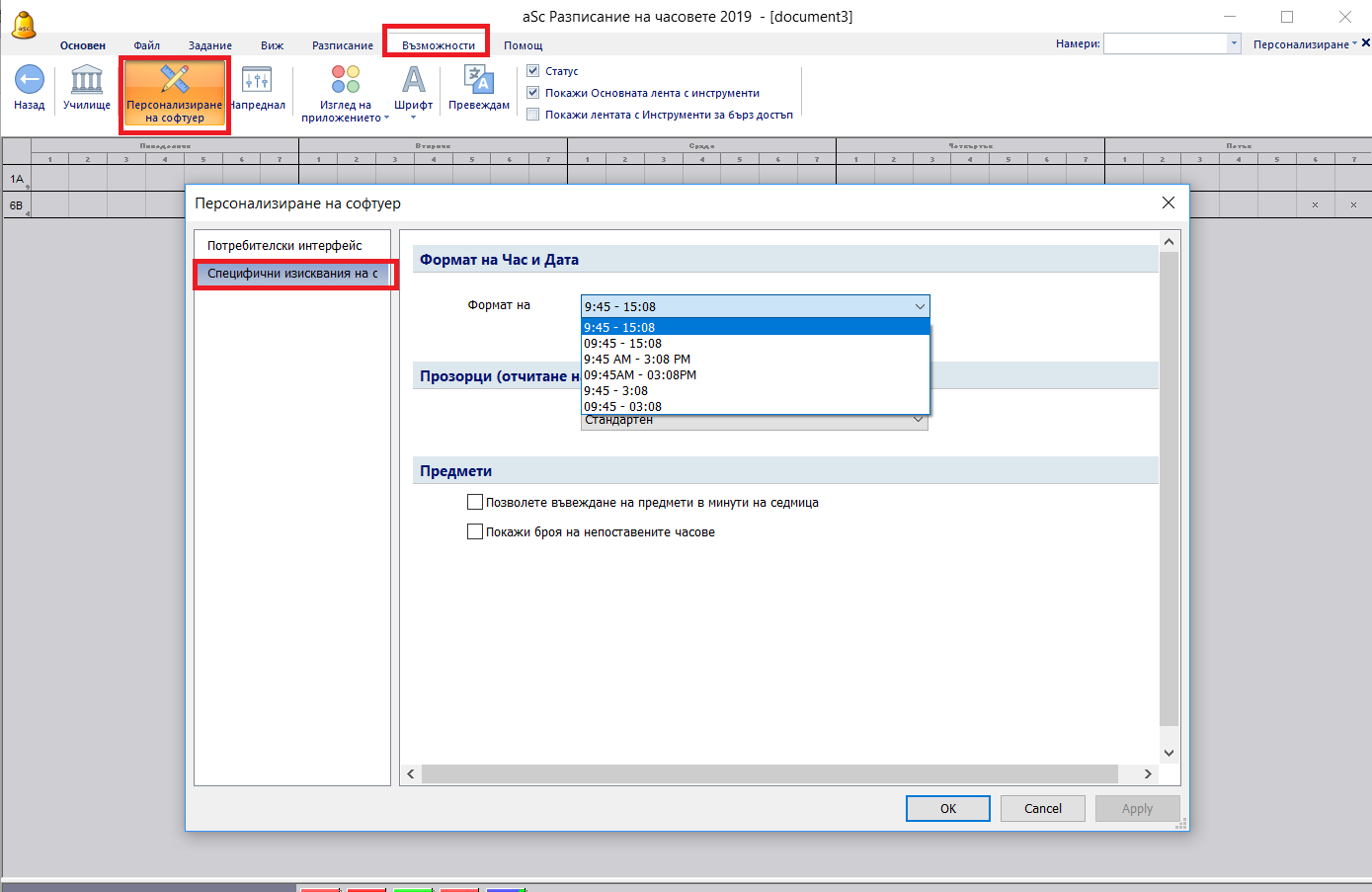 В меню Възможности/ Персонализация на софтуер можете да промените формата за време, който ще бъде използван за разпечатките за начало и край на учебния час: