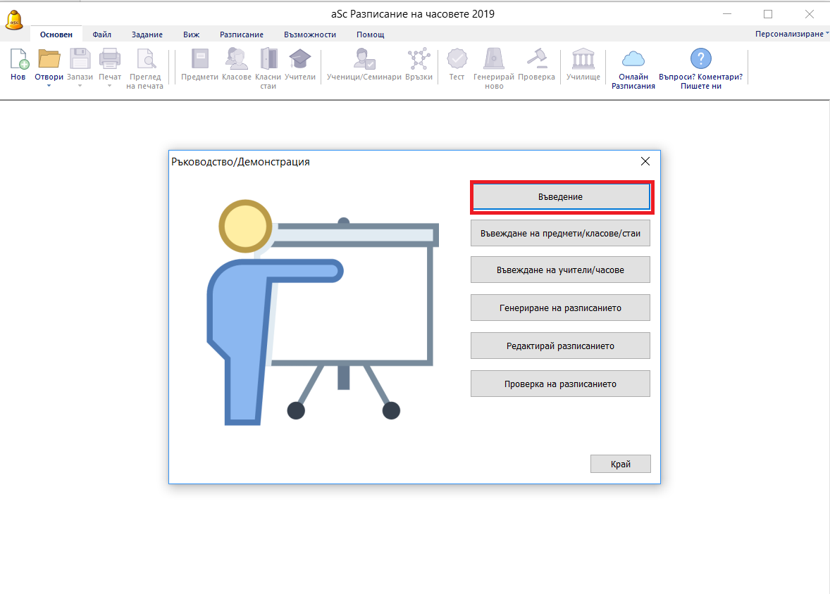 Видео презентацията може да се пусне от диалоговия прозорец за демонстрации или от меню „Помощ“ – „Ръководство/Демонстрация“: