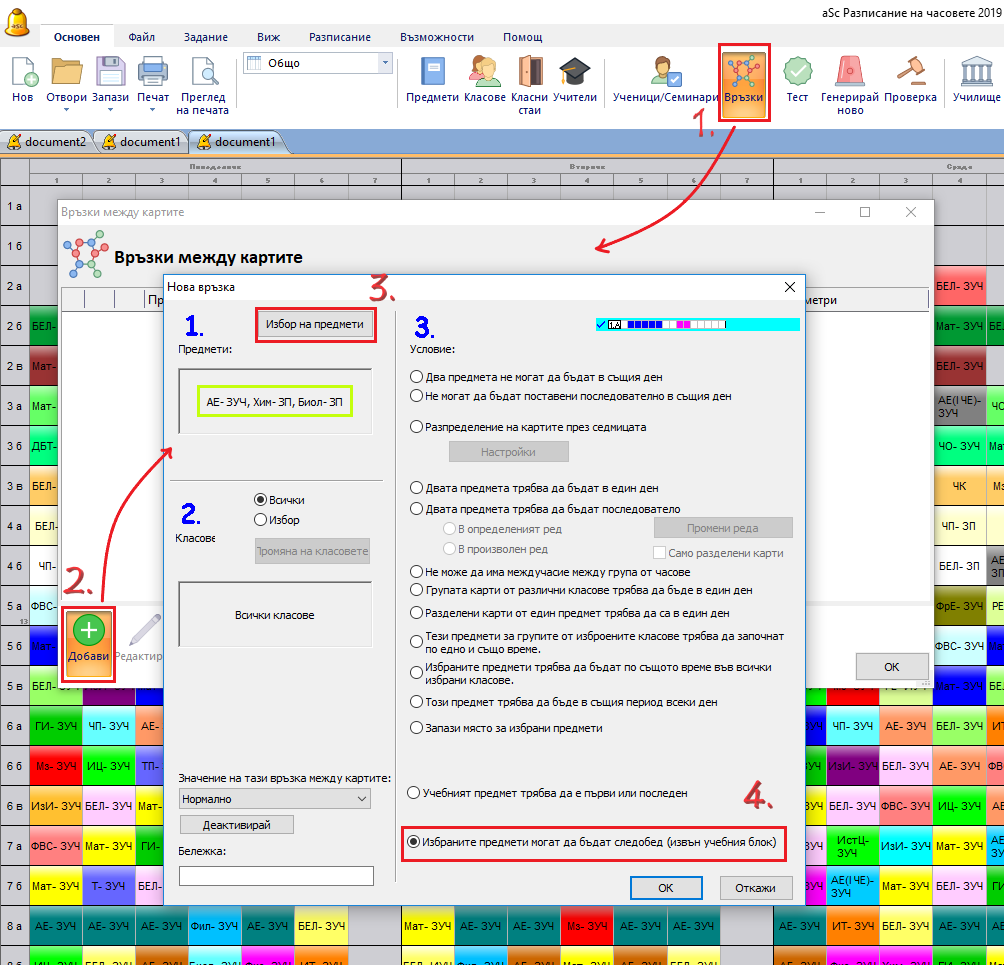 - можете също така да промените неподходящото време за класове и учебни предмети, за да поберете разписанието в по-малко часове; в някои ситуации тоза е по-лесно от добавянето на връзка.