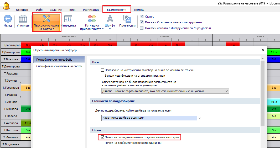 - това се отнася само до разпечатки; разписанието в софтуера ще показва два единични часа.