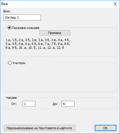 Въведете, кои дни ще се показват, както и брой часове на ден. Определете брой часове като включите и нулевите часове. След това изберете класовете или учителите, които желаете да виждате на този изглед.