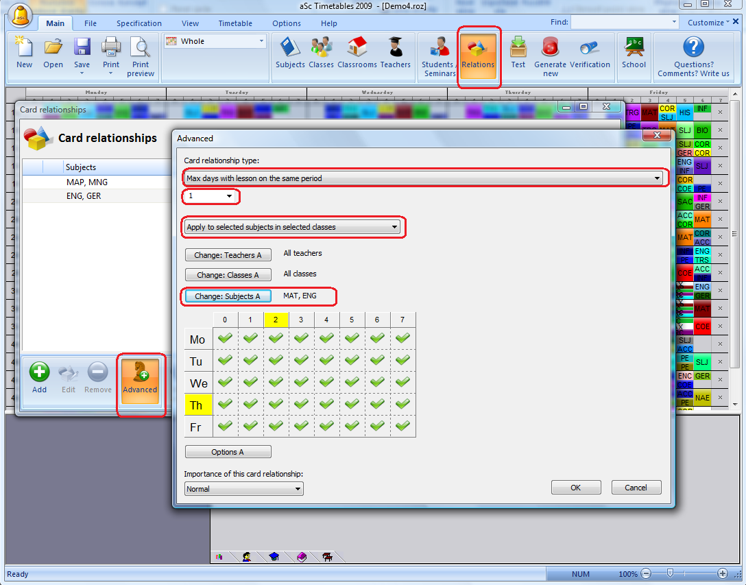 El cuadro de arriba muestra dos asignaturas en aquella relación entre fichas. Sin embargo desde que hemos especificado "Aplicar a asignaturas elegidas en clases elegidas" entonces cada asignatura es tratada por separado en cada clase. Así que sólo necesita definir una relación entre fichas para establecer que habrá sólo una lección de matemáticas y una del inglés en cada periodo durante la semana.