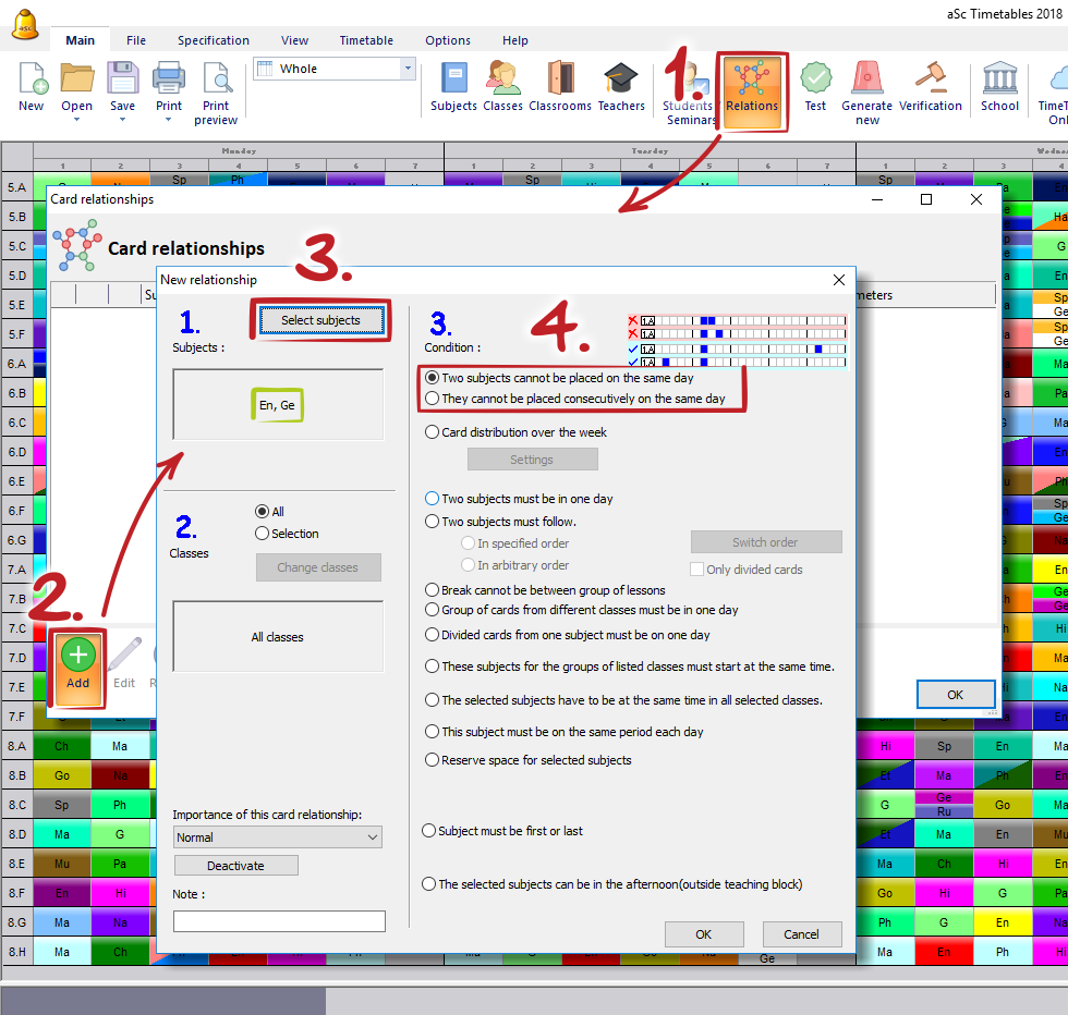 Puede crear la relación entre fichas la cual definirá que dos asignaturas no pueden seguir una tras otra o estar en el mismo día: