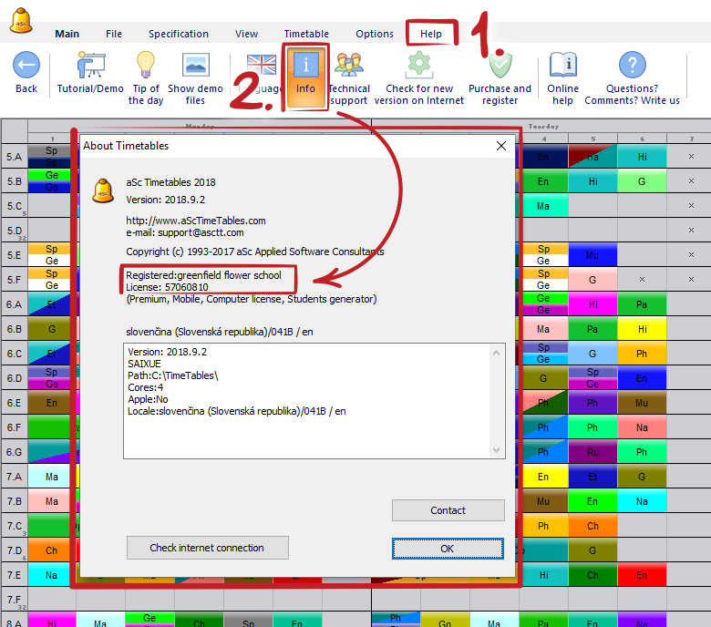 En algunas funciones para exportar datos (ejemplo Exportar a XML), se tiene como límite un máximo de 10 horarios y 10 lecciones. Para liberar este límite Usted necesita un código especial de registro en su computadora. Si Usted es un usuario registrado de aSc Timetables, puede solicitar este código en forma gratuita, solicitándolo vía correo electrónico a support@asc.sk. Por favor envíenos la siguiente información: