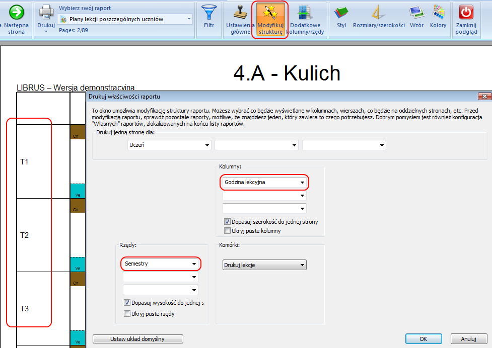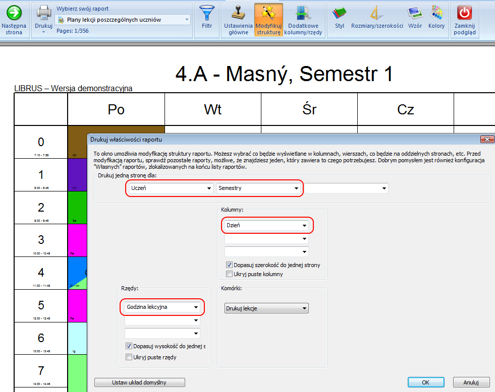 Aby był widoczny taki właśnie plan lekcji należy przejść do zakładki Podgląd wydruku i wybrać opcję Modyfikuj strukturę i ustawić, co ma być wyświetlane w rzędach: