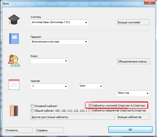 Например, если учитель учит географию в своем кабинете, и он также преподает и физкультуру, тогда его уроки по физкультуре будут назначаться только в спортзал, если это указанно в информации предмета (то есть установлен кабинет предмета физкультура - спортзал).