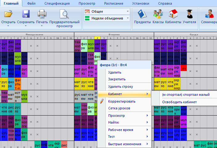 1. Вы можете вручную выбрать кабинет для каждого урока с помощью правой кнопки мыши:
