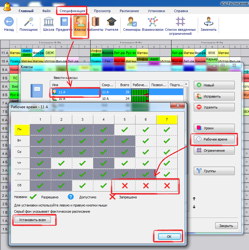 Используя кнопку "Установить всем" можно скопировать рабочее время данного класса другим классам.